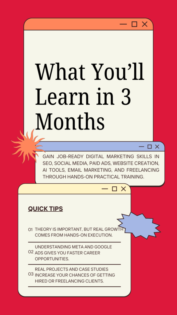 The Digital Marketing Course at Adzy Academy is a 3-month intensive, practical training program designed to make you job-ready. This course focuses on real skills, live tools, and hands-on execution rather than theory alone.
